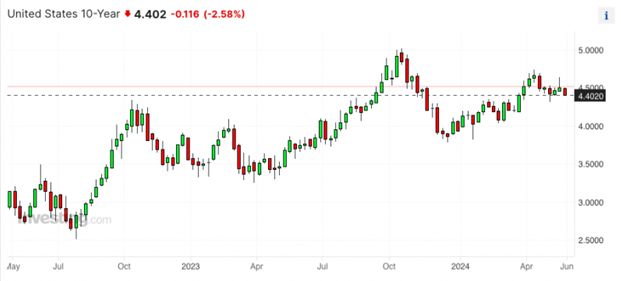 Wie werden sich all diese Informationen auf den Anleihenmarkt auswirken? Wird die Erwartung von Zinssenkungen der Fed aufgrund der Nachrichten steigen oder sinken? Und wie wird sich der U.S. Dollar Index entwickeln? Beantworten Sie diese Fragen, und Sie werden eine Vorstellung davon haben, wie sich die COMEX-Edelmetalle in diesem Minenfeld bewegen könnten. Beginnen wir mit dem Anleihemarkt. Wie Sie unten sehen können, erreichte die Rendite der 10-jährigen US-Staatsanleihe Anfang Oktober letzten Jahres einen Höchststand von fast 5,00%. Zu diesem Zeitpunkt erreichte der Goldpreis an der COMEX einen Tiefstand von fast 1.800 Dollar. Niedrigere Renditen sind im Allgemeinen gut für Gold, daher sollten Sie diesen Kurs in den nächsten zwei Wochen genau beobachten.