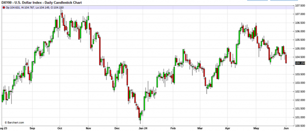 Änderungen der Zinssätze werden sich auch auf den US-Dollar-Index auswirken. Im Allgemeinen bedeutet ein steigender Dollar-Index Gegenwind für die Edelmetallpreise an der COMEX, während ein fallender Dollar-Index Gold und Silber Auftrieb verleiht. Beachten Sie, dass der nachstehende Chart des Dollar-Index sehr ähnlich aussieht wie der Chart der Rendite zehnjähriger Anleihen. Beide erreichten Anfang Oktober ihren Höchststand, beide erreichten Ende Dezember ihren Tiefststand, und beide erreichten im April erneut ihren Höchststand. Daraus lässt sich schließen, dass bei fallenden Zinsen auch der Dollar-Index fallen wird, und wenn der Dollar fällt, erholen sich die COMEX-Edelmetalle häufig.