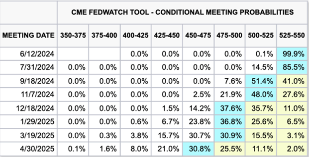 Und wie sieht es mit der Wahrscheinlichkeit einer Leitzinssenkung aus? Nach dem Stand vom 3. Juni scheint eine Zinssenkung vor Jahresende sicher zu sein, während die Wahrscheinlichkeit von zwei Zinssenkungen etwa 50/50 beträgt.