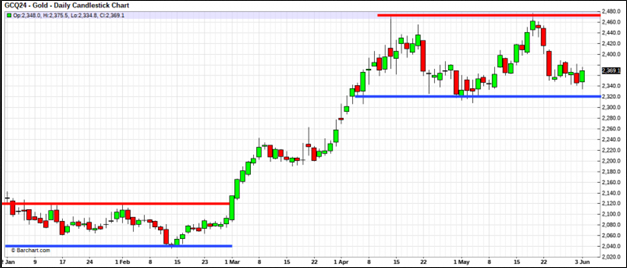 Auf dem nachstehenden Chart des COMEX-Goldpreises können Sie sehen, wo der Preis in einer Handelsspanne und Konsolidierungsphase feststeckt. Wie können wir den Beginn einer neuen Preisrally erkennen? Beobachten Sie das obere Ende der Spanne. Ein Ausbruch über 2.480 Dollar bis 2.500 Dollar sollte genügend Schwung erzeugen, um den Preis in Richtung unseres nächsten Ziels bei 2.650 Dollar zu treiben.