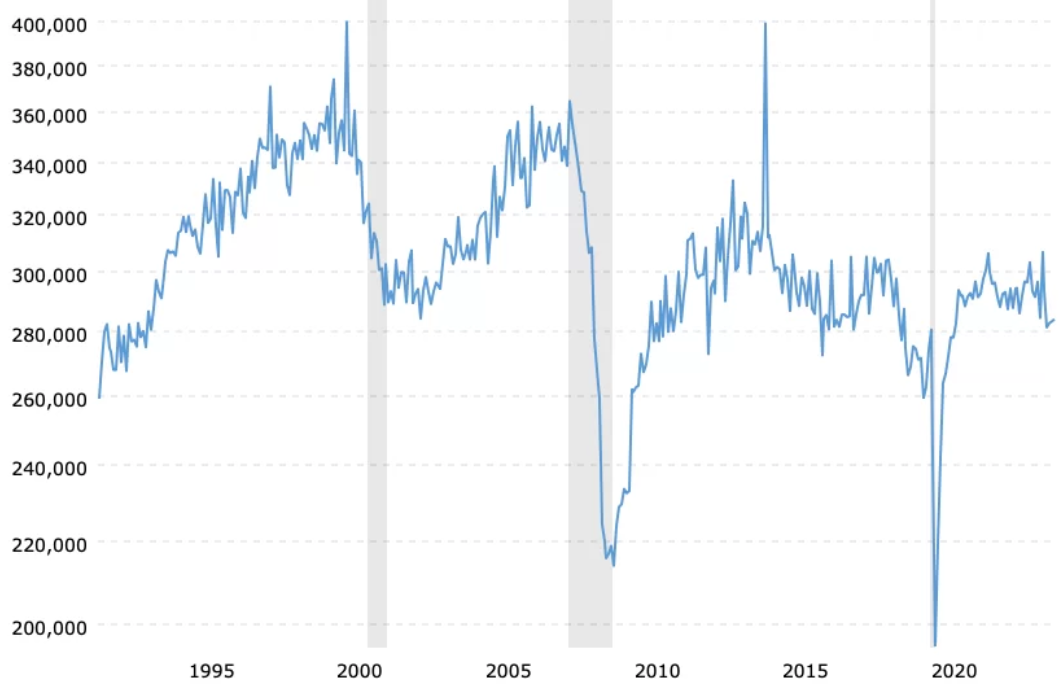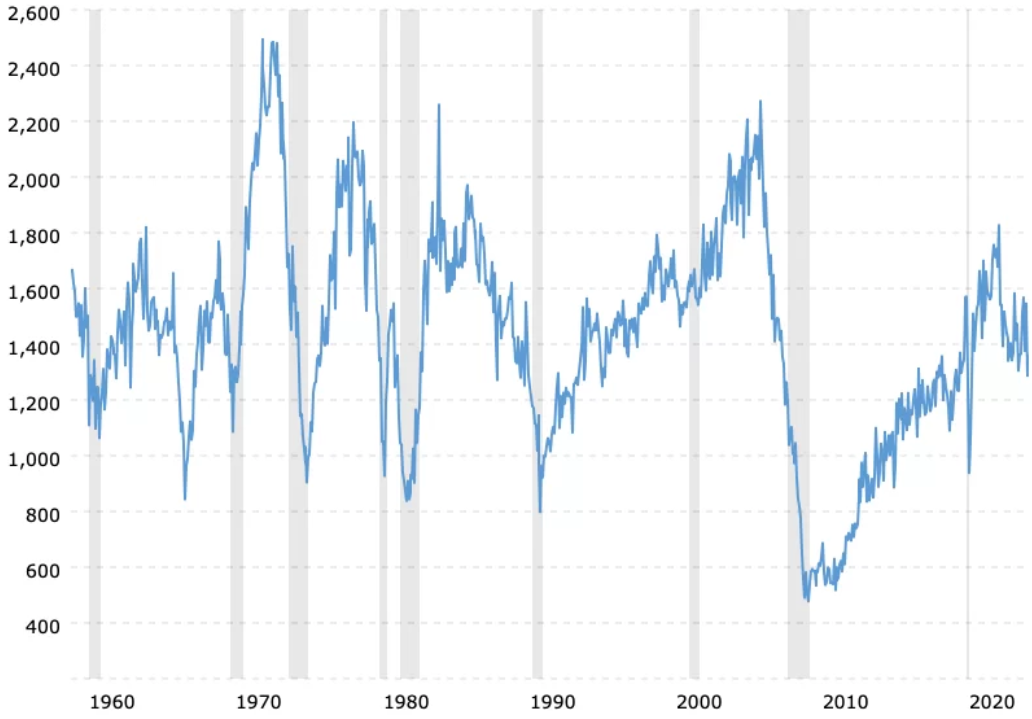 Der Höhepunkt der Baubeginne wurde in den frühen 1970er Jahren erreicht. Seitdem gab es viermal einen extremen Tiefstand, gefolgt von einem längeren Aufschwung ("wenn du es baust, werden sie es kaufen"). Der Chart bezieht sich auf die tatsächlichen Baubeginne - nicht auf die Verkäufe, nicht auf die Preise, nicht auf die im Bau befindlichen Einheiten usw. Der langfristige Trend bei den Baubeginnen ist rückläufig, und auf die Phasen des Anstiegs folgt die Wiederaufnahme des langfristigen Abwärtstrends. Das entspricht der Definition eines Dead Cat Bounce.