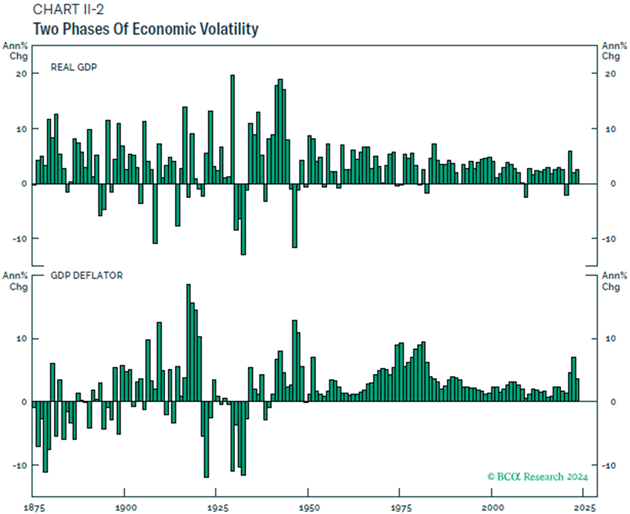 "Bevor wir vorwärts gehen, müssen wir zuerst zurückgehen, denn es ist wichtig zu verstehen, wie wir in die gegenwärtige Situation geraten sind. Chart II-2 zeigt 150 Jahre US-Wirtschaftsgeschichte mit Wirtschaftswachstum und Inflation bis zurück ins Jahr 1875. Eines fällt dabei ganz deutlich auf: Das Wirtschaftsleben war in der ersten Hälfte des Zeitraums sehr viel unbeständiger als in der zweiten Hälfte.