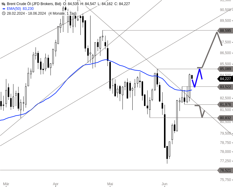 Nach einer Seitwärtsbewegung am mittelfristigen Abwärtstrend konnte Brent diesen am Montag direkt dynamisch nach oben durchbrechen. Auch die Hürde bei 83,52 USD konnte im späten Handel nachhaltig überwunden werden.