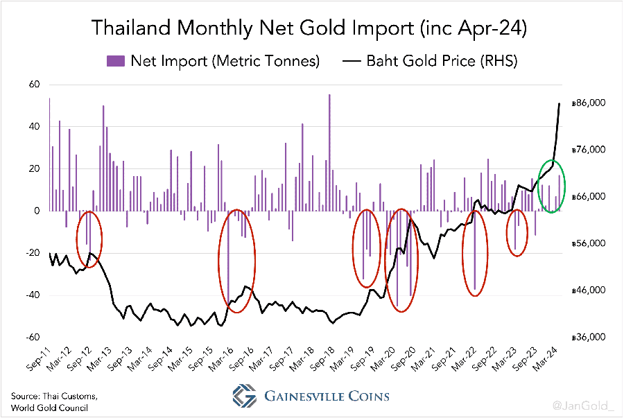 Internationale Handelsstatistiken zeigen, dass Thailand China seit November 2023 gefolgt ist. Anstatt kontinuierlich zu akkumulieren und bei Preiserhöhungen zu verkaufen, war Thailand ein solider Nettoimporteur, während der Goldpreis um 20% von 72.100 thailändischen Baht je Unze im Oktober 2023 auf 85.700 thailändischen Baht im April 2024 (von 2.000 Dollar auf 2.300 US-Dollar) stieg.