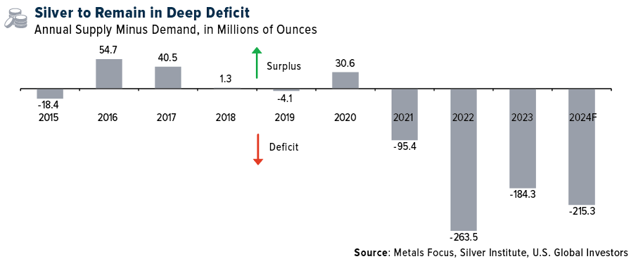 Wir haben das vierte Jahr in Folge ein strukturelles Marktdefizit bei Silber zu verzeichnen. Es wird erwartet, dass sich das Defizit um 17% auf 215,3 Mio. Unzen ausweiten wird. Treue Leser sollten wissen, was passiert, wenn die Nachfrage das Angebot übersteigt - die Preise steigen.