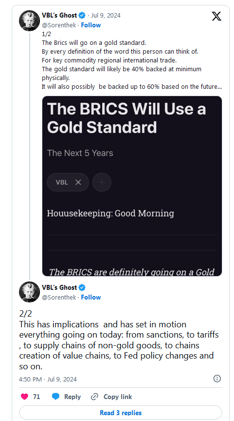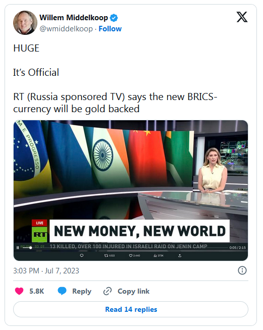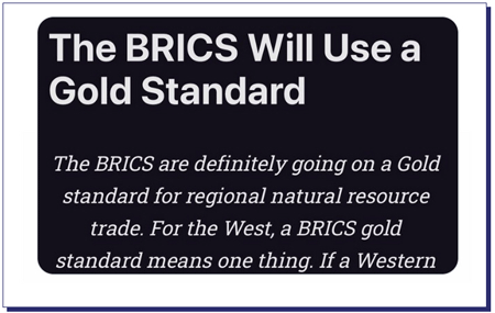 "Die BRICS werden einen Goldstandard einführen. Nach jeder Definition des Wortes, die sich diese Person vorstellen kann. Für den internationalen Handel mit den wichtigsten Gütern der Region. Der Goldstandard wird wahrscheinlich zu mindestens 40% physisch unterlegt sein. Möglicherweise wird er auch bis zu 60% gesichert sein, je nach der künftigen Gewichtung des Goldes in der von jedem Mitgliedsland in den BRICS-Einheitenkorb eingebrachten Währung.