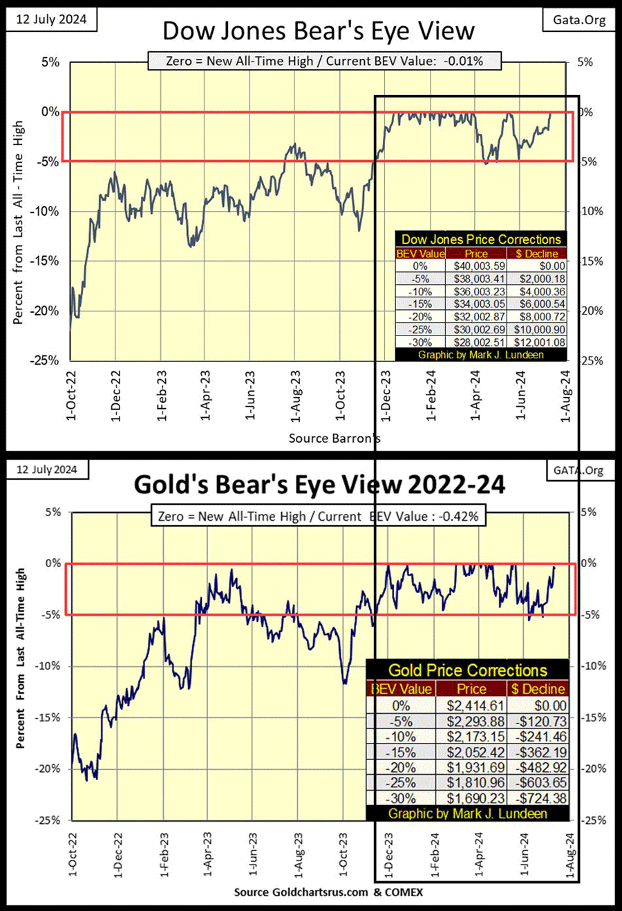 All das ist offensichtlich, aber was nicht offensichtlich ist, ist, wie sehr sich Gold wie der Dow Jones gehandelt hat, seit auch er geschlossen hat und seit letztem November in der Scoring-Position geblieben ist (BEV-Werte zwischen -0,01% und -4,99%). In den letzten acht Monaten haben sich die BEV-Charts des Dow Jones und des Goldes bemerkenswert ähnlich entwickelt; sie stiegen in die Scoring-Position und blieben dort für lange Zeit, während sie neue Allzeithochs erreichten. Nachfolgend finden Sie einen BEV-Chart (Bear's Eye View) für den Dow Jones und Gold, der bis Oktober 2022 zurückreicht.