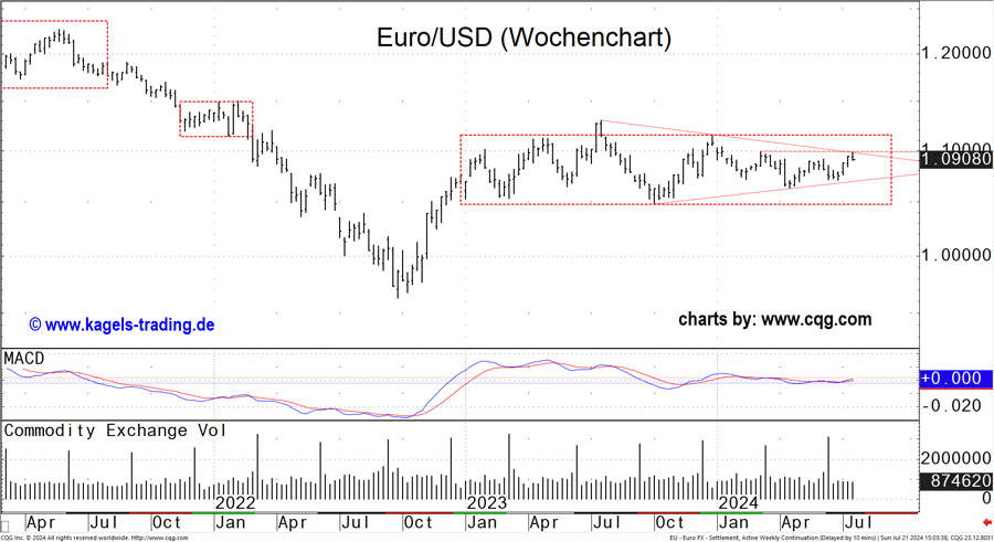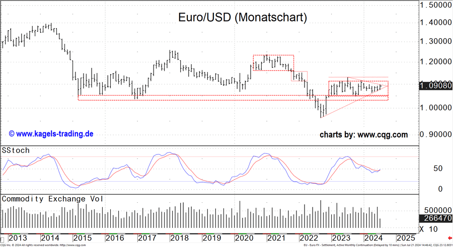 Aus der Sichtweise des langfristigen Monatscharts befindet sich der Euro Future seit Januar 2023 in der eingezeichneten neutralen Seitwärtsbewegung. Eingegrenzt wird diese neutrale Zone mit den Widerständen um 1,1080 und 1,1130, erweitert um das Hoch aus dem Juli 2023 bei 1,1305 und den analytisch extrem bedeutsamen Unterstützungen zwischen 1,0370 und 1,0550. Diese untere im Chart gekennzeichnete Zone ist durch wichtige Marktwendepunkte aus März 2015, Ende 2016, dem ersten Quartal 2017, sowie mehreren Monatstiefs aus 2023 charakterisiert. Erst Kurse außerhalb der eingezeichneten Seitwärtsbewegung etablieren eine neue langfristige Trendrichtung.