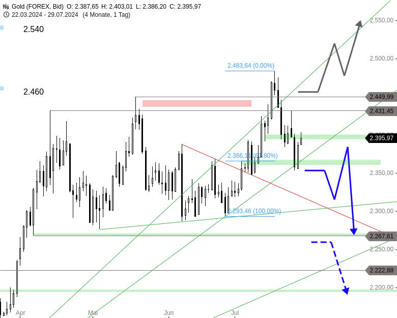 Oberhalb von 2.400 USD könnte es dagegen zu einer Aufwärtsbewegung bis 2.431 USD kommen. Doch erst über dem vorletzten Rekordhoch bei 2.449 USD wäre der aktuelle Abwärtsmove überstanden und auch ein Anstieg in Richtung des Kursziels bei 2.540 USD wieder realistisch. Gold Chartanalyse (Tageschart)