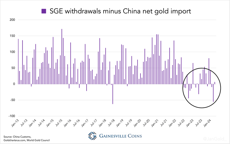 Sowohl 2022 als auch 2023 überstiegen die Nettoeinfuhren Chinas plus Minenproduktion die SGE-Entnahmen (ganz zu schweigen davon, wenn man recyceltes Gold hinzurechnet).
