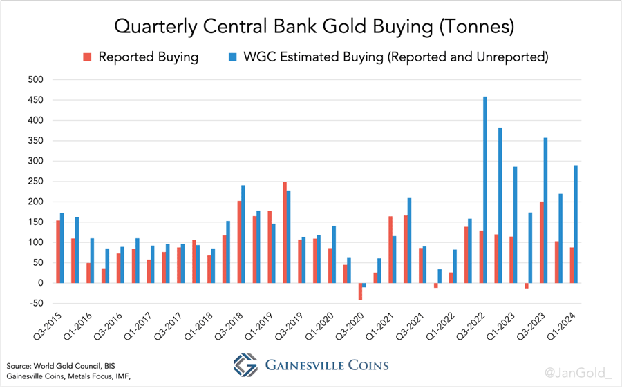 Vergleicht man die geschätzten Zentralbankkäufe des WGC, die auf Feldforschung beruhen, mit den offiziellen Statistiken über die Goldkäufe der Zentralbanken, so weiß man, dass die Währungsbehörden seit Beginn des Ukraine-Kriegs im Februar 2022 insgesamt viel mehr heimlich kaufen, als sie melden. Ich habe bereits geschrieben, dass diese heimlichen Käufe zu etwa 80% der PBoC zugeschrieben werden können.