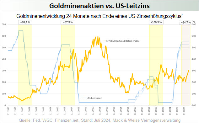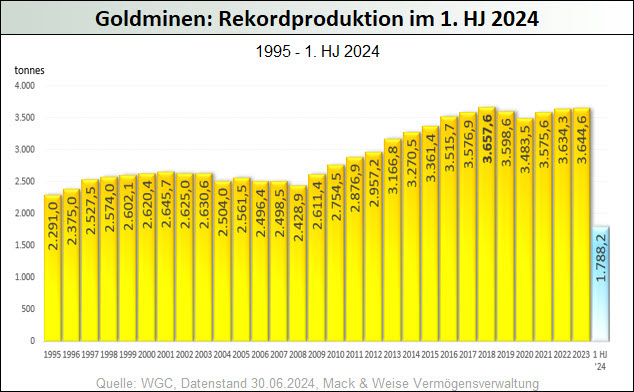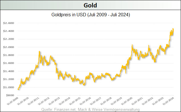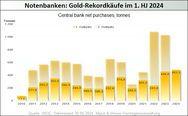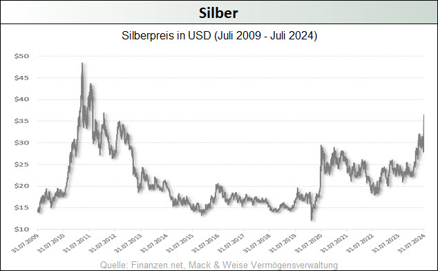 Allerdings rechnen die Investoren aber auch fest damit, dass die Fed auch angesichts der zahlreichen schwächelnden Konjunkturindikatoren die Zinsen im September nun endlich senken wird. Eine eingeleitete US-Zinswende wiederum könnte dann mit Blick auf die – auch unter Trump zu erwartende – extreme Defizitpolitik (CBO-Juni-Prognose Fiskaljahr 2024: 1.915 Mrd. USD (+408 Mrd. USD ggü. Februar-Prognose) bzw. 6,7% des BIP; 50-Jahres-Durchschnitt: 3,7 %) eine Dollarschwäche auslösen, die die Edelmetallpreise – auch durch weitere Käufe der auf hohen Dollarreserven sitzenden Notenbanken - auf neue Höchststände treibt.