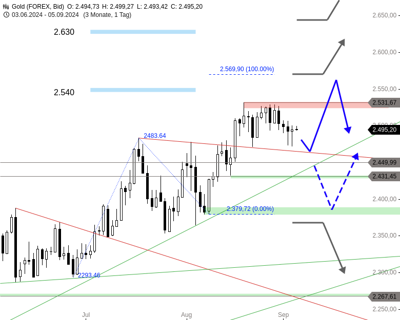 Weiterhin dürfte der Goldpreis entlang der Oberseite der früheren Konsolidierung in Richtung 2.449 und 2.431 USD zurücksetzen und erst dort neuen Schwung entfalten. Mit einem Anstieg über 2.531 und 2.540 USD könnte eine Kaufwelle bis 2.570 USD führen. An dieser Stelle dürfte allerdings der nächste Korrekturmove folgen und ein Anstieg bis an das Kursziel bei 2.630 USD zunächst ausbleiben.