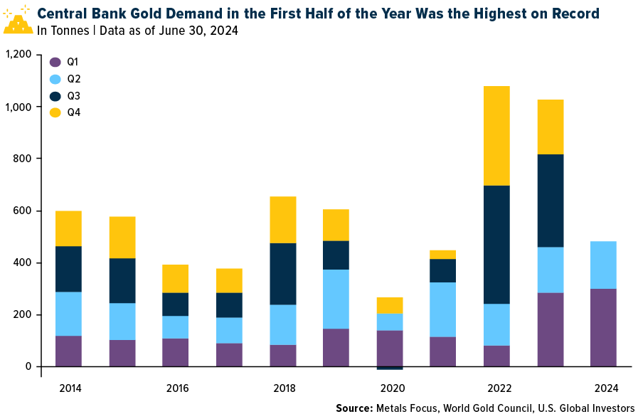 Es sind nicht nur die Anleger, die den Goldpreisanstieg vorantreiben. Auch die Zentralbanken spielen eine wichtige Rolle. In den letzten Jahren haben diese Institutionen ihre Goldreserven beträchtlich aufgestockt, und es gibt keine Anzeichen dafür, dass ihr Kaufrausch nachlässt. Die Käufe der Zentralbanken machen inzwischen etwa ein Viertel der gesamten weltweiten Goldnachfrage aus und sind damit doppelt so hoch wie vor 2022. Nach Angaben des World Gold Council (WGC) erreichten die Goldkäufe in der ersten Jahreshälfte ein neues Rekordhoch von 483 Tonnen, was einem Anstieg von 5% gegenüber dem gleichen Zeitraum im Jahr 2023 entspricht.