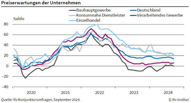 Immer weniger Unternehmen in Deutschland wollen ihre Preise erhöhen. Die IFO-Preiserwartungen sanken im September auf 13,8 Punkte, nach 16,1 per August. Das ist der niedrigste Wert seit Februar 2021.