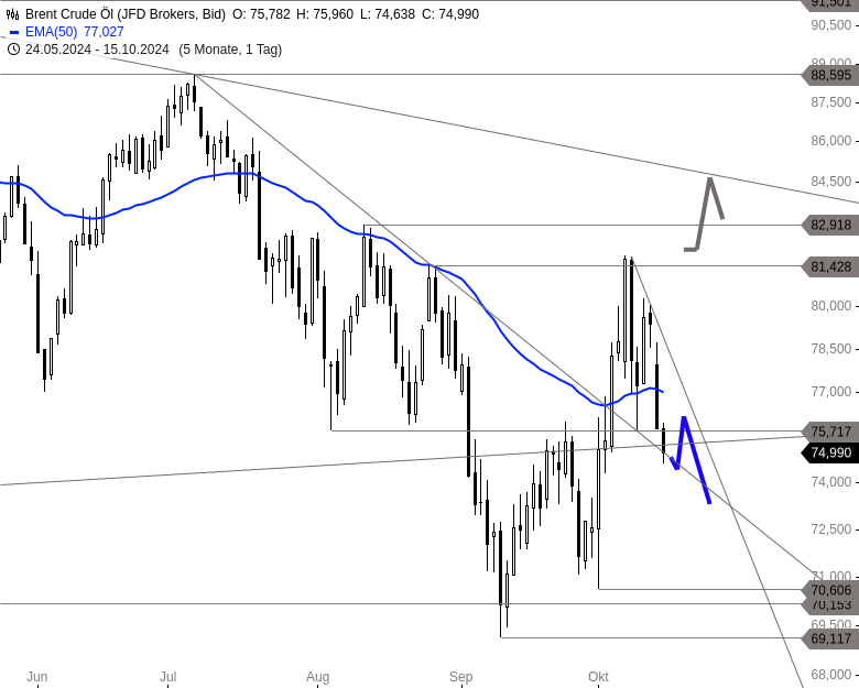 Es besteht die Chance, dass der Kursverlauf nach einem zweiten Test des gebrochenen Abwärtstrends im Einzugsbereich der 75,72 USD nochmals nach oben abdrehen kann. Die erhöhte Abwärtsdynamik, bei einem Rückfall unter die Tiefs der Vortage, lässt aber auch weitere Abgaben bis 73,52 USD und später 70,60 USD möglich werden. Die Ausbruchsbewegung ist klar gefährdet. Erst oberhalb der 78,54 USD hellt sich das Chartbild wieder deutlich auf.