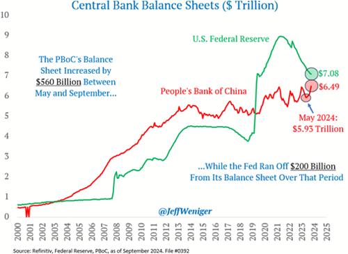Wie auch anderswo versucht die chinesische Regierung, die Wirtschaft mit fiskal- und geldpolitischen Anreizen anzukurbeln. Bis zu einem gewissen Grad ist das nicht neu. Die People's Bank of China hat ihre Bilanz seit über 20 Jahren fast ununterbrochen ausgeweitet.