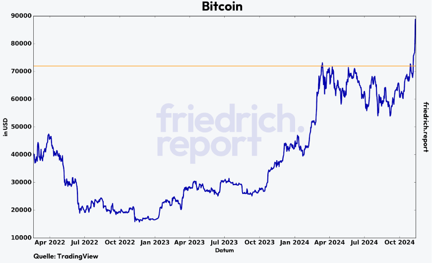 Trump hat das Comeback des Jahres geschafft, während die Ampel - Regierung in sich zusammengefallen ist. Davon wird ebenso Bitcoin beflügelt und erreicht neue Höchststände. Der orange Mann ist wieder im Amt und meine Lieblingsempfehlung, Bitcoin, legte gleich ein neues Allzeithoch nach. Wir haben buchstäblich den Trump Pump gesehen und die größte positive Kursentwicklung innerhalb eines Tages. Bitcoin ist am 11.11.2024 um 10.000 US-Dollar gestiegen und gipfelte bei knapp 90.000 US-Dollar.