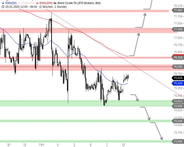 Weiterhin ist unklar, ob ein Bodenbildungsversuch läuft oder nur eine weitere Erholung im Bärenmarkt. Klar sind hingegen die Triggermarken: 76 und 76,32 USD auf der Oberseite und 74,65 - 74,81 USD auf der Unterseite. Klettert der Ölpreis nachhaltig über 76,35 USD, eröffnen sich Erholungschancen bis 77,31 und 77,89 - 77,98 USD.
