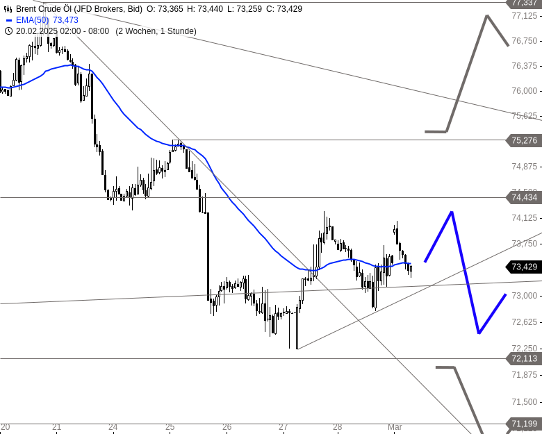Die Stabilisierung könnte sich an den kommenden Handelstagen fortsetzen, wobei eine Bodenbildung abzuwarten bleibt. Ein klarer Ausbruch aus dem Abwärtstrend, über 75,00 USD, könnte eine Aufwärtsbewegung bis 77,34 USD einleiten.- Alternativ wird es unterhalb der 72,00 USD nochmals bärischer. In diesem Fall droht ein weiterer Rutsch bis 70,61 USD und später 69,12 USD.