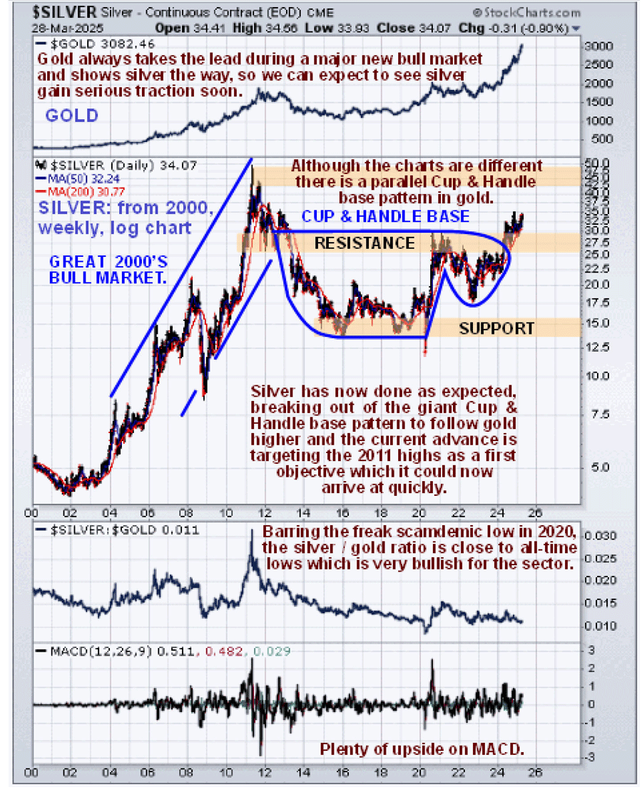 Wenn wir noch weiter zurückgehen und Gold auf einem Log-Chart vom Beginn des Jahrtausends, d.h. vom Jahr 2000 an, betrachten, sehen wir, dass der Aufwärtstrend vom Anfang des letzten Jahres daraus resultierte, dass der Preis aus einem wirklich massiven Cup-&-Handle-Konsolidierungsmuster ausbrach, das sich nach dem Höchststand von 2011 bis 2012 zu bilden begann, der das Ende des großen Bullenmarktes markierte.