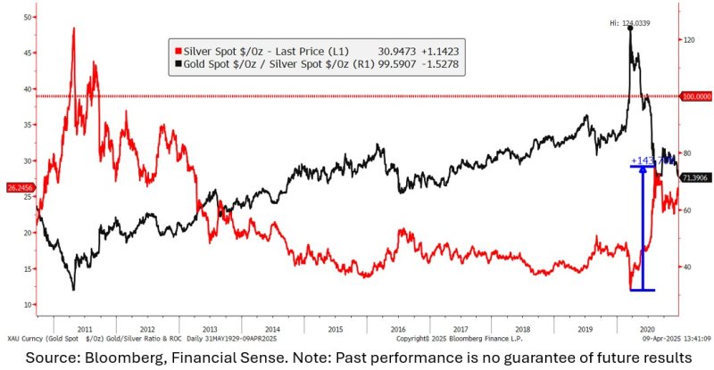 Als Trump die Zölle für 90 Tage aussetzte, legte der S&P 500 um mehr als 9,5% zu - der größte Anstieg seit der Krise von 2008 oder der Großen Depression! Noch beeindruckender ist jedoch, was auf den Edelmetallmärkten geschah, etwas, das wir im letzten Jahrhundert nur dreimal erlebt haben. Am 9. April erreichte das Verhältnis von Gold zu Silber den seltenen Wert von 100:1, was bedeutet, dass Gold jetzt 100 Mal teurer ist als sein industrielles Gegenstück. Aufgrund dieses historisch seltenen Preisgefälles und in Anbetracht der folgenden Charts habe ich mich entschlossen, das Engagement unseres Unternehmens in Silber zu erhöhen.