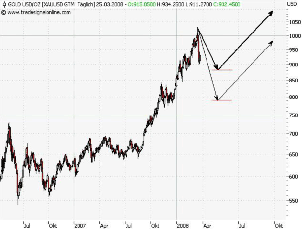 Gold hat seinen Anstieg am 17.03.08 bei 1032 USD beendet und die Zwischenkorrektur begonnen. Innerhalb von 4 Tagen hat das Edelmetall -13 % verloren und notiert aktuell bei 949,53 USD. Die Korrektur sollte bis 24.05.08 andauern und in den Preisbereich 882-789 USD abwärts führen. Die Wahrscheinlichkeit für 882 USD ist größer als für 789 USD. Nach der Korrektur gehen wir von der Fortsetzung des Aufwärtstrends aus.
