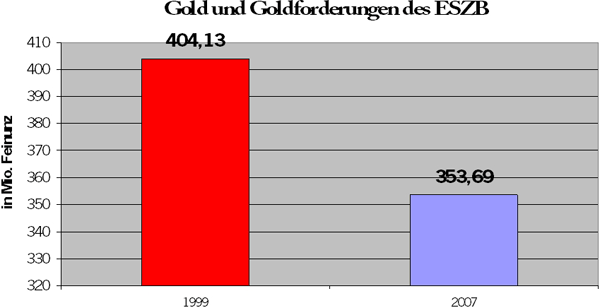 Trotz der Aufnahme Griechenlands in die Eurozone im Jahr 2001 sanken die einzig brauchbaren Aktiva des ESZB von 404,13 Millionen Feinunzen Gold auf 355,73 Millionen Feinunzen. Ein Rückgang von beachtlichen 12,2% im Beobachtungszeitraum.