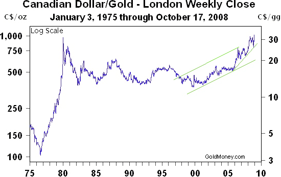 Als Gold letzte Woche schloss, erreichte es dabei neue Rekordhöchststände gegenüber dem Australischen Dollar, dem Kanadischen Dollar, dem Südafrikanischen Rand und dem Britischen Pfund. Hier sind die langfristigen Charts, gemessen in diesen Währungen.