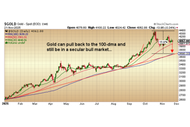 Anders ausgedrückt: Ich wette darauf, dass wir den 100-tägigen Durchschnitt vor 4.100 USD sehen werden, wobei zu bedenken ist, dass, wenn Gold in den nächsten Monaten einfach in einem engen Bereich seitwärts handelt, die X-Achse den 100-tägigen Durchschnitt in Richtung des flachen Goldpreises nach oben treiben wird, um die Prophezeiung zu erfüllen. Kurzfristig begünstigt der [...]