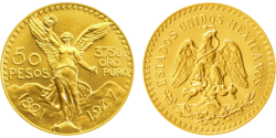 (Hinweis: Fehlt hingegen die Nennwertangabe von 50 Pesos und ist an Stelle dieser das Feingewicht doppelt vorhanden, so handelt es sich um eine nur im Jahr 1943 geprägte Version mit dem Namen "37,5 Gramos de Oro Puro", die kein gesetzliches Zahlungsmittel war und somit auch nicht als Münze bezeichnet werden darf.)