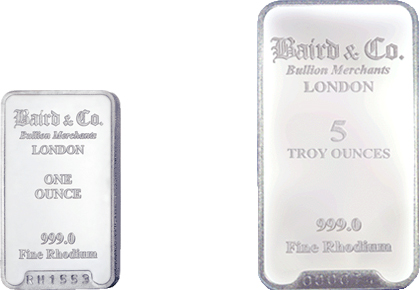 Im Jahr 2012 stellte der an der Londoner LPPM zertifizierter Barrenproduzent Baird & Co. Limited den ersten Anlagebarren in Rhodium vor. Die ausschließlich geprägten Barren werden in fünf Größen (5 oz, 1 oz, 1/2 oz, 1/4 oz und 1/10) angeboten. Für den deutschen und schweizerischen Markt werden zudem unter dem Degussa-Label ein 100 Gramm und 1 Unzen Rhodiumbarren produziert.