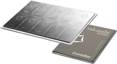 In Silber sind die CombiBars aus dem Hause Valcambi in zweierlei Varianten erhältlich. Sie bestehen dabei aus einem Verbund von 100 1-Gramm- oder zehn 10-Gramm-Silberbarren, die eine stabile Einheit bilden. Bei Bedarf jedoch können ein oder mehrere Barren dank der exakt berechneten Sollbruchstelle verlustfrei voneinander getrennt werden.