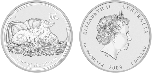 Die australische Prägestätte The Perth Mint prägte, wie schon im Jahr 1996 als erstes Tierkreiszeichen die Maus. Das Motiv der alten neuen Serie ist unterschiedlich. Die neue Maus von 2008 zeigt zwei Mäuse oder Ratten auf Heu, im Hintergrund sind Steine zu sehen. Das chinesische Zeichen für Maus, 鼠, befindet sich rechts über den Tier. Ein kleines "P" auf der linken Seite verweist auf die Scheideanstalt Perth Mint. Das Motiv trägt die Unterschrift "Year of the Mouse".