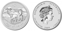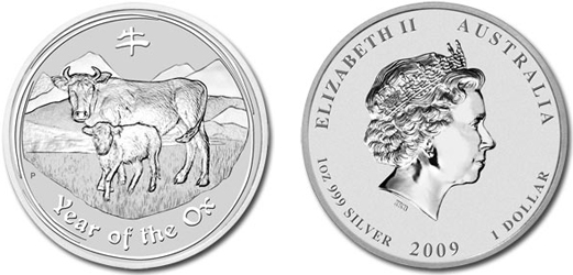 | 1 oz | 1,00 AU$ | Ochse, Lunar-Kalender II | 2009 | geprägt | 999 | 31,135 g | Ø 45,60 x 2,60 mm |