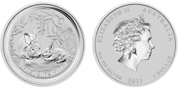 | 1 oz | 1,00 AU$ | Hase, Lunar-Kalender II | 2011 | geprägt | 999 | 31,135 g | Ø 45,60 x 2,60 mm |