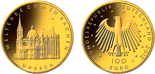 Die 100-Euro-Goldmünze "Dom zu Aachen" stellt die neunte Ausgabe aus der deutschen UNESCO-Welterbe-Reihe und die elfte deutsche 1/2-oz-Goldmünze dar. Eine siebenköpfige Jury unter Vorsitz des Berliner Medailleurs Jordi Truxa leitete den Wettbewerb zur Münzgestaltung für das Jahr 2012. 12 Künstlerinnen und Künstler wurden eingeladen, prämiert und zur Ausführung empfohlen wurde der Entwurf des in München ansässigen Medailleurs Erich Ott.