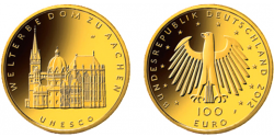 Als erstes deutsches Bauwerk wurde im Jahr 1978 der Dom zu Aachen in die Welterbeliste der UNESCO aufgenommen. Daher war es nur eine Frage der Zeit bis das Dommotiv auf einer 100-Euro-Goldmünze zu finden ist.
