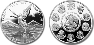 Dies änderte sich erstmals im Jahr 1905, als Mexiko mit der Herausgabe von Peso-Goldmünzen ("Centenario-Familie") begann. Silberfans mussten noch einige Jahrzehnte warten bis schließlich 1982, ein Jahr nach dem Libertad in Gold, die erste mexikanische (und zugleich weltweit) erste Bullionmünze in Silber erschien.