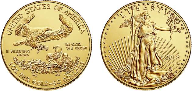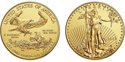 Auf der anderen Münzseite des American Eagle ist die Liberty nach einem Entwurf des berühmten amerikanischen Bildhauers Augustus Saint-Gaudens (1848-1907) abgebildet. Die Freiheitsstatue, das amerikanische Freiheitssymbol, trägt in der rechten Hand eine Fackel, in der linken einen Olivenzweig. Die Strahlen im Hintergrund symbolisieren den Sonnenaufgang. Etwas unscheinbar ist links unten das Kapitol (das amerikanische Parlament) zu erkennen. Die 50 Sterne, die auf die 50 US-Bundesstaaten verweisen, sind in einem nicht durchgehenden Kreis angeordnet.
