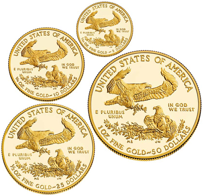 Die United States Mint gibt unter gleichem Namen, aber mit einem anderen Motiv, Anlagemünzen auch in Silber und Platin heraus. Trotz des hohen Materialwertes werden die Goldmünzen ungeschützt, zu mehreren Stück in Tubes, ausgeliefert. Die Popularität des American Gold Eagle ist außerhalb der USA deutlich geringer, was nicht nur an der Vielzahl der Mitwettbewerber liegt, sondern auch am etwas höheren Aufpreis und der 916er Feinheit.