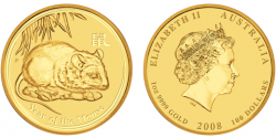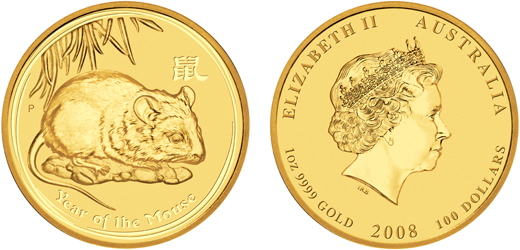 Die australische Prägestätte The Perth Mint prägte, wie schon im Jahr 1996 als erstes Tierkreiszeichen die Maus. Das Motiv der alten neuen Serie ist unterschiedlich. Die neue Maus von 2008 zeigt eine auf Gestein sitzende Maus, umgeben von Blattwerk. Das chinesische Zeichen für Maus, oder auch oft als Ratte bezeichnet, 鼠, befindet sich rechts über den Tier. Ein kleines "P“ auf der linken Seite verweist auf die Scheideanstalt Perth Mint. Das Motiv trägt die Unterschrift "Year of the Mouse".