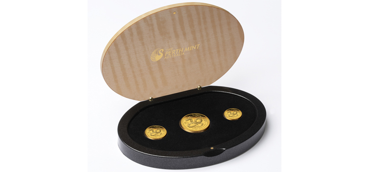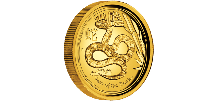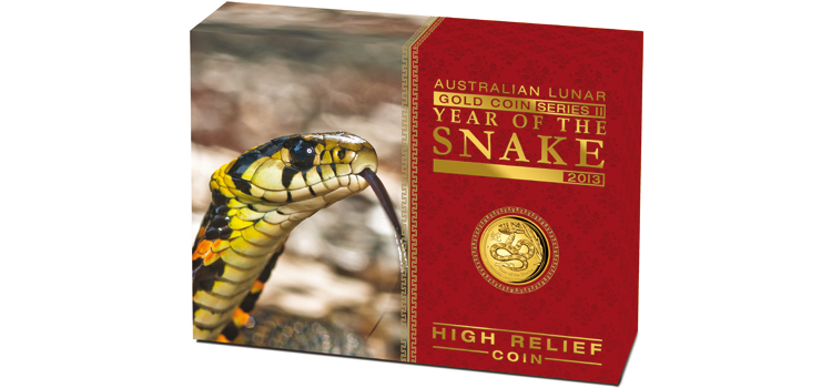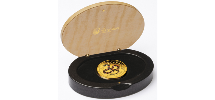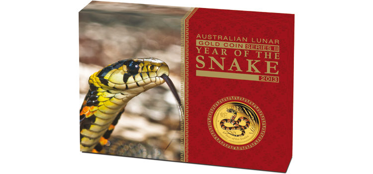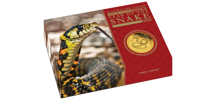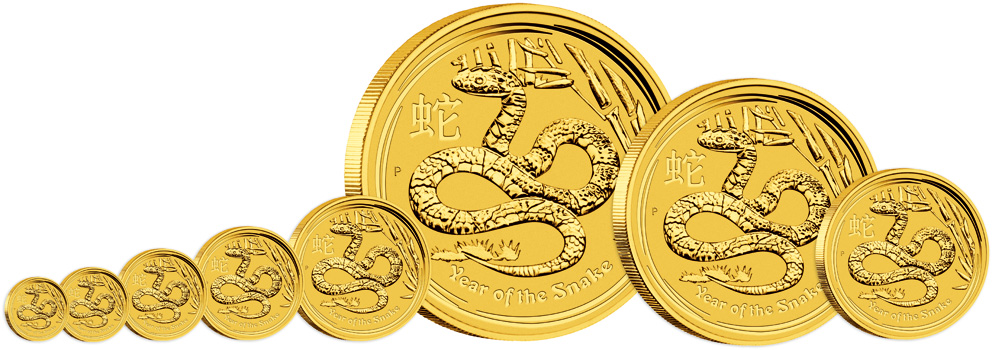 Die australischen Lunar-Goldmünzen "Jahr der Schlange" werden analog zu den Vorjahren in unterschiedlichen Größen geprägt, die von der 1/20-Unze bis zum 10-kg-Exemplar reichen. Außer den beiden begrenzten Auflagen des 1-Unzen-Exemplars (max. 30.000 Stück) und der 10-Kilogramm-Münze (max. 100 Stück), werden alle anderen Stückelungen nach Nachfrage produziert. Eine Privy Mark-Ausgabe, wie sie es als 1-Unzen-Münze in Silber gibt, gibt es in Gold nicht.