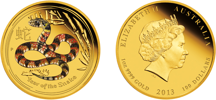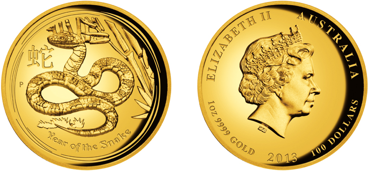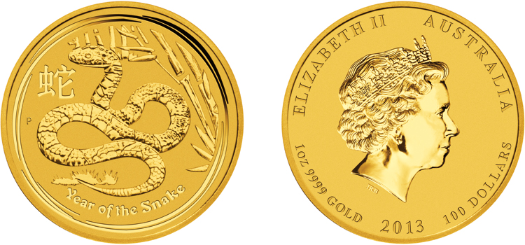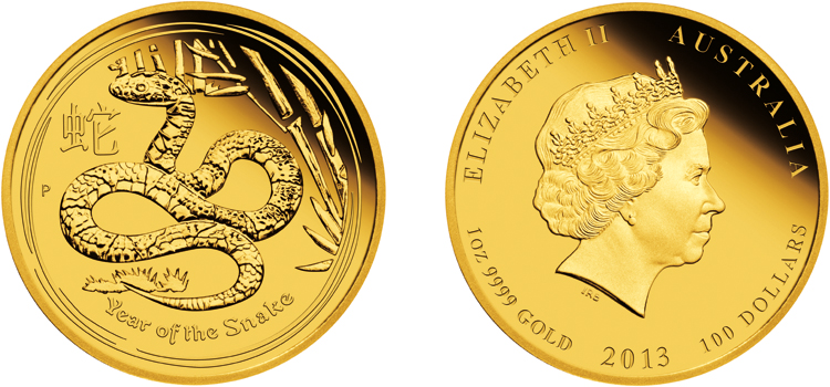| 1 oz | 100,00 AU$ | Schlange - Lunar-Kalender II | 2013 | geprägt | 9999 | 31,112 g | Ø 39,34 x 2,50 mm |