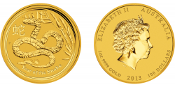 | 2 oz | 200,00 AU$ | Schlange - Lunar-Kalender II | 2013 | geprägt | 9999 | 62,215 g | Ø 41,10 x 3,90 mm |