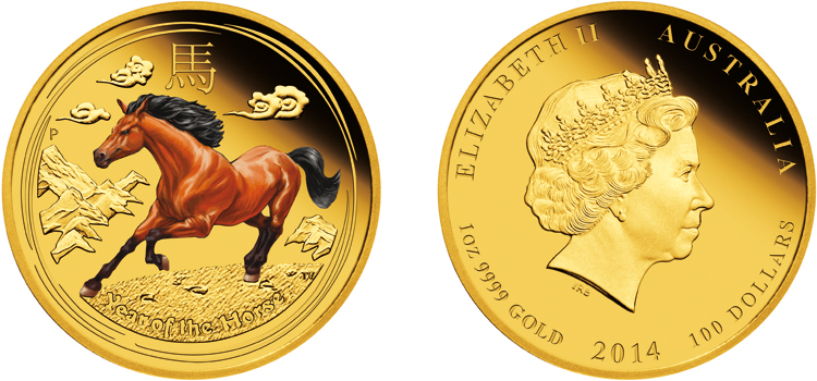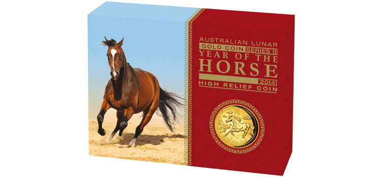 | 1/2 oz | 50,00 AU$ | Pferd - Lunar-Kalender II | 2014 | geprägt | 9999 | 15,554 g | Ø 30,60 x 2,50 mm |