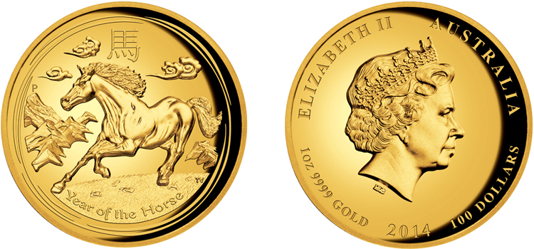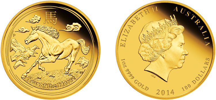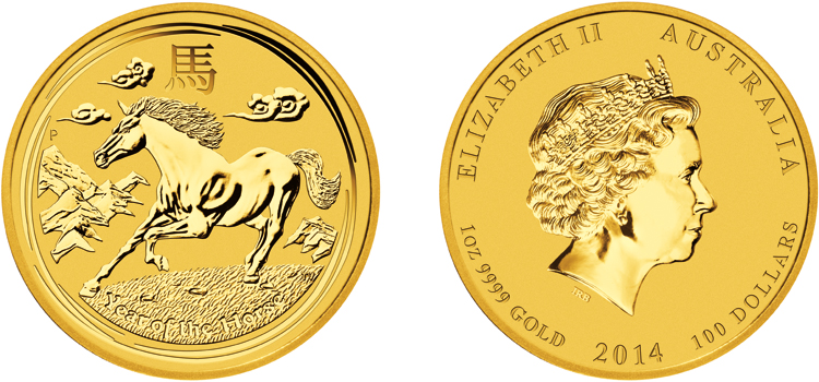 | 1 oz | 100,00 AU$ | Pferd - Lunar-Kalender II | 2014 | geprägt | 9999 | 31,112 g | Ø 39,34 x 2,50 mm |