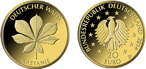 | 1/8 oz | 20,00 € | 20 Euro "Deutscher Wald" - Kastanie | 2014 | geprägt | 9999 | 3,89 g | Ø 17,50 x 1,15 mm |