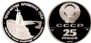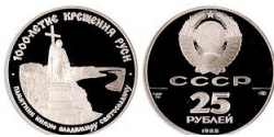 | 1 oz | 25,00 RUB | 1000 Jahre Russland Großfürst Vladimir | 1988 | geprägt | 999,5 | 31,103 g | Ø 37,00 x 2,70 mm |