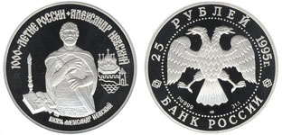 | 1 oz | 25,00 RUB | 1000 Jahre Russland Fürst Newskij | 1995 | geprägt | 999,5 | 31,103 g | Ø 37,00 x 2,70 mm |
